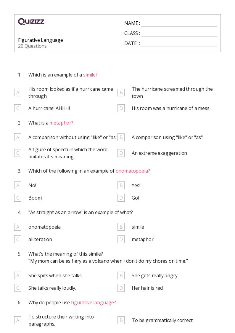 Download free worksheets on figurative language! Metaphor, simile, personification, hyperbole, alliteration, onomatopoeia, & more. Find a variety of worksheets to teach and practice figurative language techniques, such as similes, metaphors, and personification, for grade 4 students. Worksheets are figurative language test, figurative language, name figurative language. Find worksheets to help students identify and explain figurative language techniques in poems, stories,.