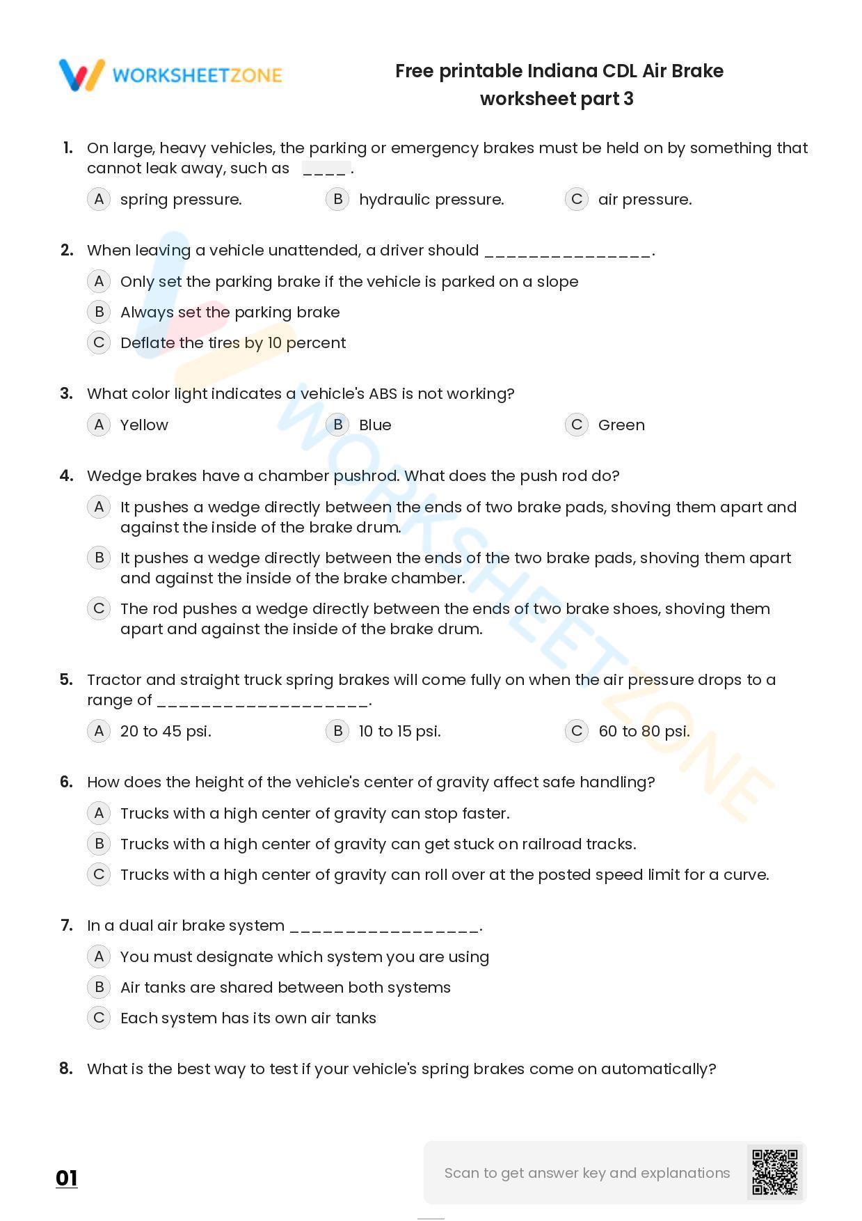 Free Printable Indiana CDL Air Brake Worksheet Part 3