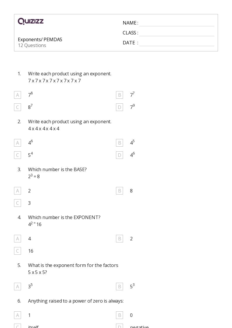 Most worksheets on this page align with common core standard 6.ee.1. Examples show how to expand an exponent into. Discover a vast collection of free printable math worksheets tailored for grade 5 students, created by quizizz to enhance their understanding and mastery of exponents in a fun. In grade 5, students start learning about exponent math and about the properties.
