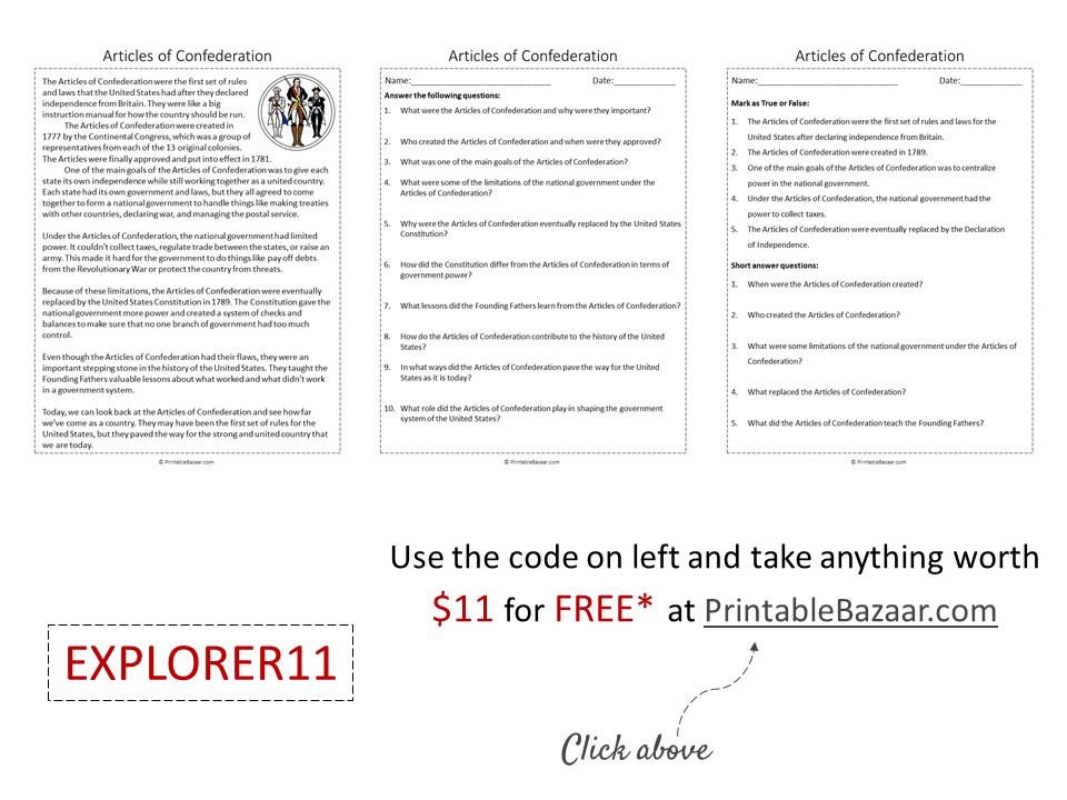 Articles of Confederation Reading Comprehension Passage Printable Worksheet Teaching Resources