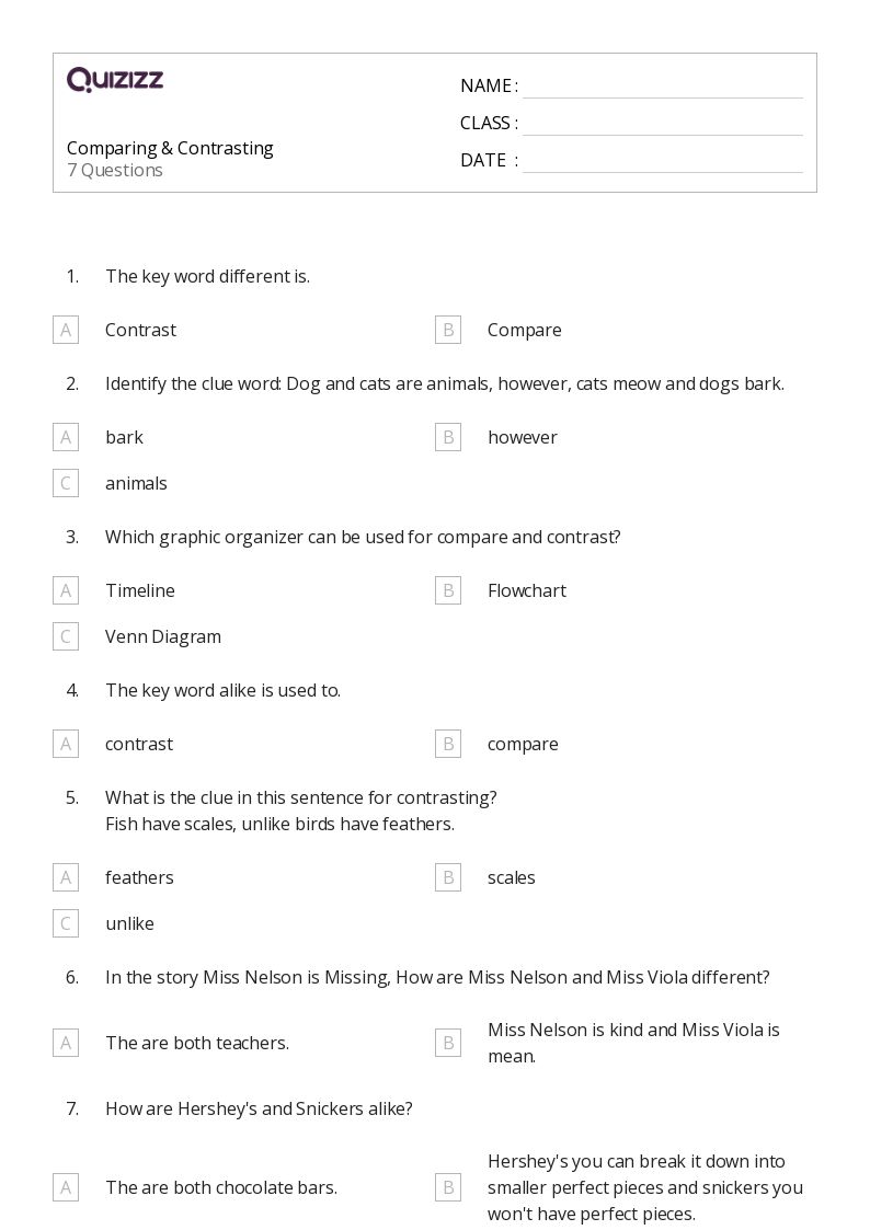 These fun compare and contrast worksheets for 5th graders online are all you need to help your. Build compare and contrast skills in young learners with our compare and contrast. Quizizz offers over 50 worksheets for grade 5 students to compare and contrast various texts,. Browse printable 5th grade comparing and contrasting worksheets. When we compare two things, we tell.