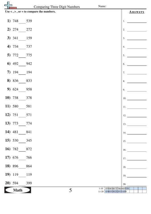 Comparing Three Digit Numbers Worksheet With Answer Key printable pdf download