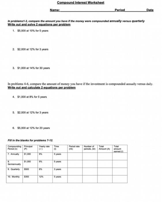 Solved Compound Interest Worksheet Name Period Date In