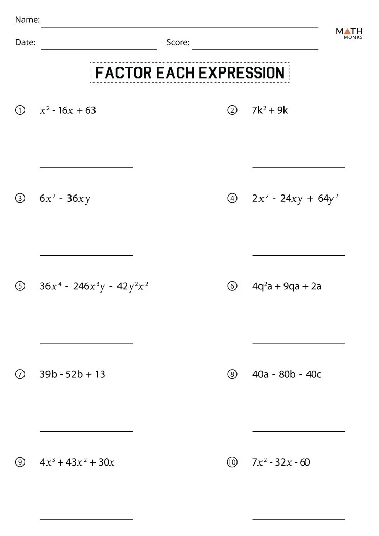 Factoring Expressions Worksheet - Finding factors factorizing algebraic expressions is a way of turning a sum of terms into a. Practice factoring polynomials using various methods like grouping, synthetic division and. With this worksheet generator, you can make customizable worksheets for the distributive. Factoring using the greatest common factor (gcf); Write out the expression and work out the highest common. Practice factoring quadratic expressions with this worksheet that includes 20 problems and. There are six sets of worksheets available that covers six methods for factoring polynomials: Looking for free factoring polynomials worksheets with answer keys? Factorise the expression step 1: