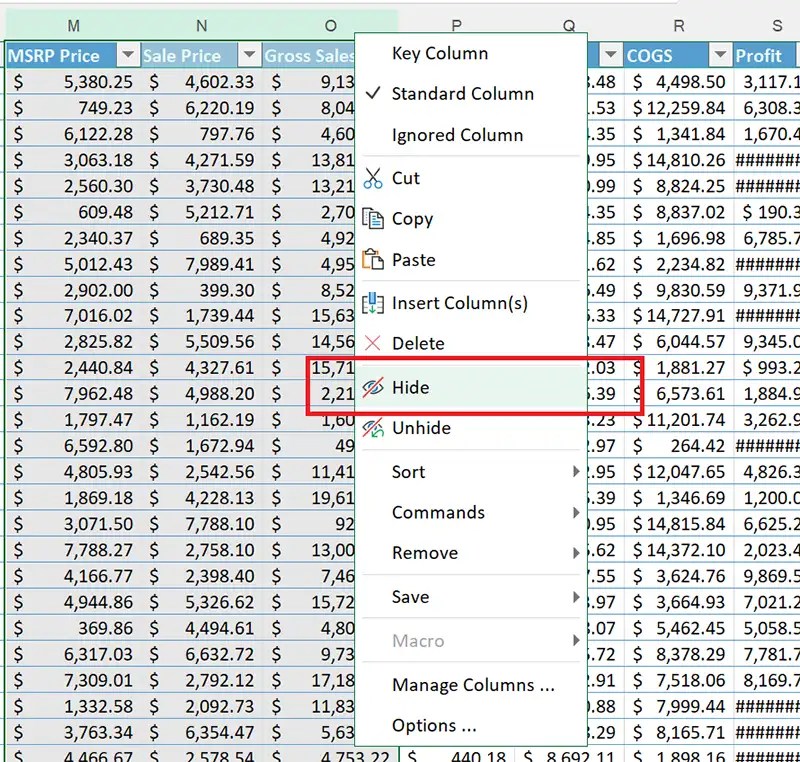 How to hide or unhide Columns in Excel worksheet