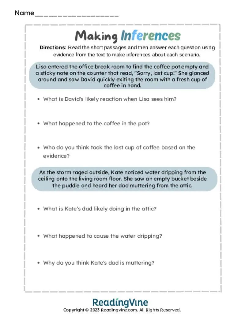 Inference Worksheets ReadingVine