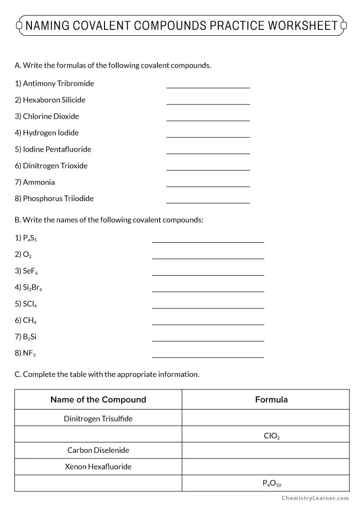 1) antimony tribromide _____ 2) hexaboron silicide. Naming covalent compounds worksheet write the chemical formulas for the following covalent compounds: Try these naming covalent compounds worksheets if you're seeking a means to reteach and offer extra help when it comes to this concept. For those of you who love covalent compounds, you’re in for a real treat! In this tutorial.