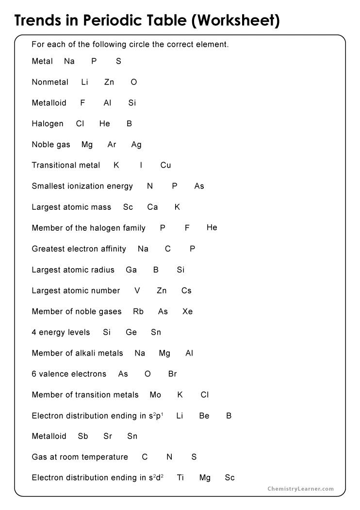 Fill in the best answer for each of the following: Atomic size increases down a group and decreases left to. Periodic trends worksheet a nswer key 1. Circle the element with the largest atomic radius and put a square around the element with the smallest atomic radius: For each of the following sets of atoms, rank the atoms from smallest.