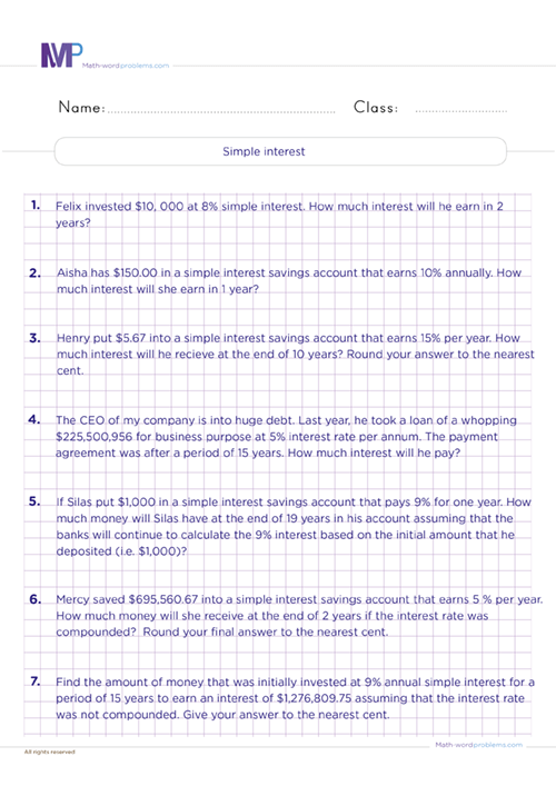 Students can also use this exercise to learn about the principal, rate of return (the net gain or loss on an investment over a specified time), and other terms commonly used in finance. Use these word questions to continue practicing how to calculate simple interest. Give your seventh graders a leg up on managing their future finances with this math worksheet featuring simple interest word problems. Students will learn the simple interest.