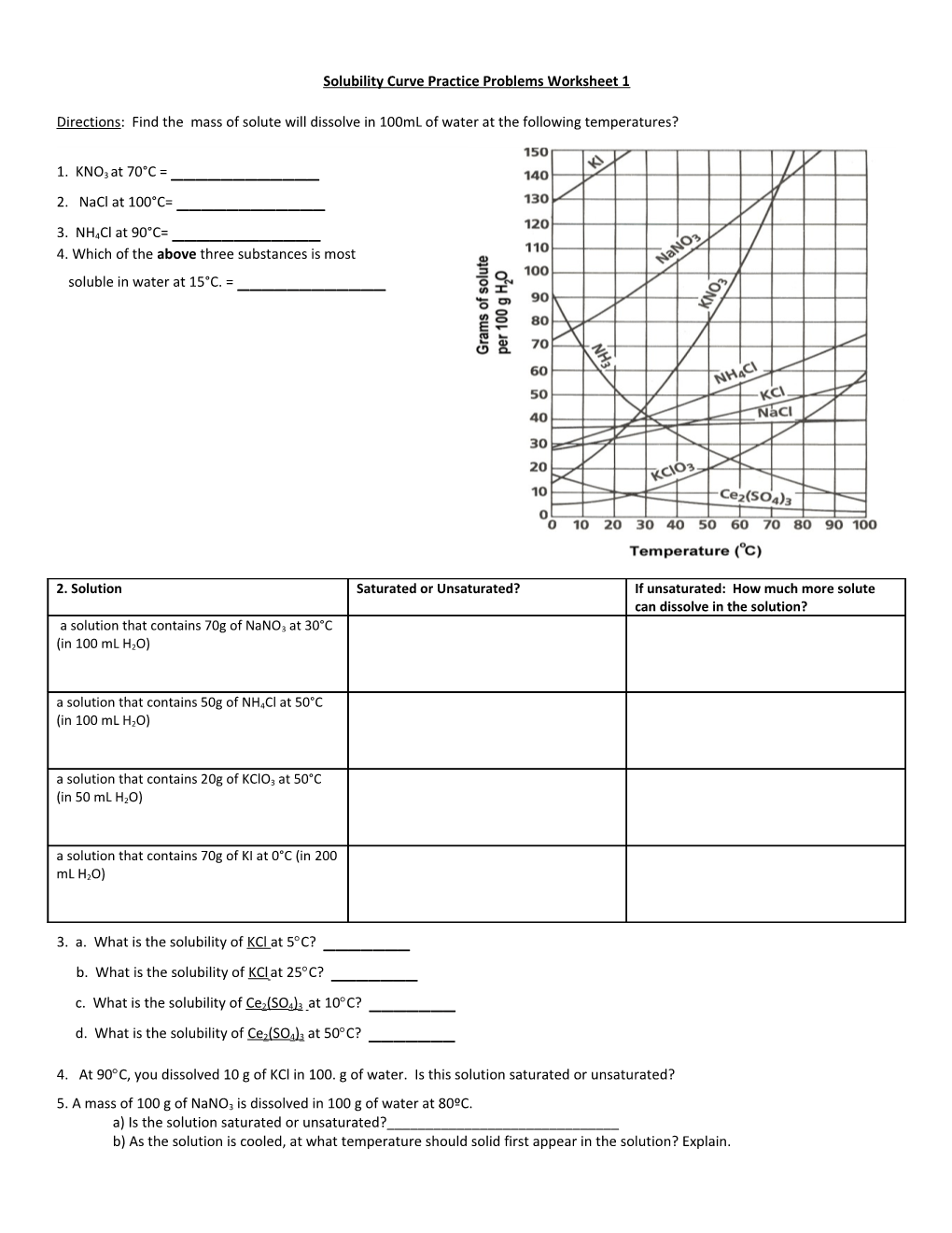Curve represents the amount of solute which will precipitate out. Solubility curve practice problems worksheet 1 directions: Solubility curve practice problems worksheet 1 you'll notice that for most substances, solubility increases as temperature increases. Use the solubility curve on the first page to label the following solutions as saturated or unsaturated. Chemistry lab worksheet on solubility curves, saturated solutions, and.