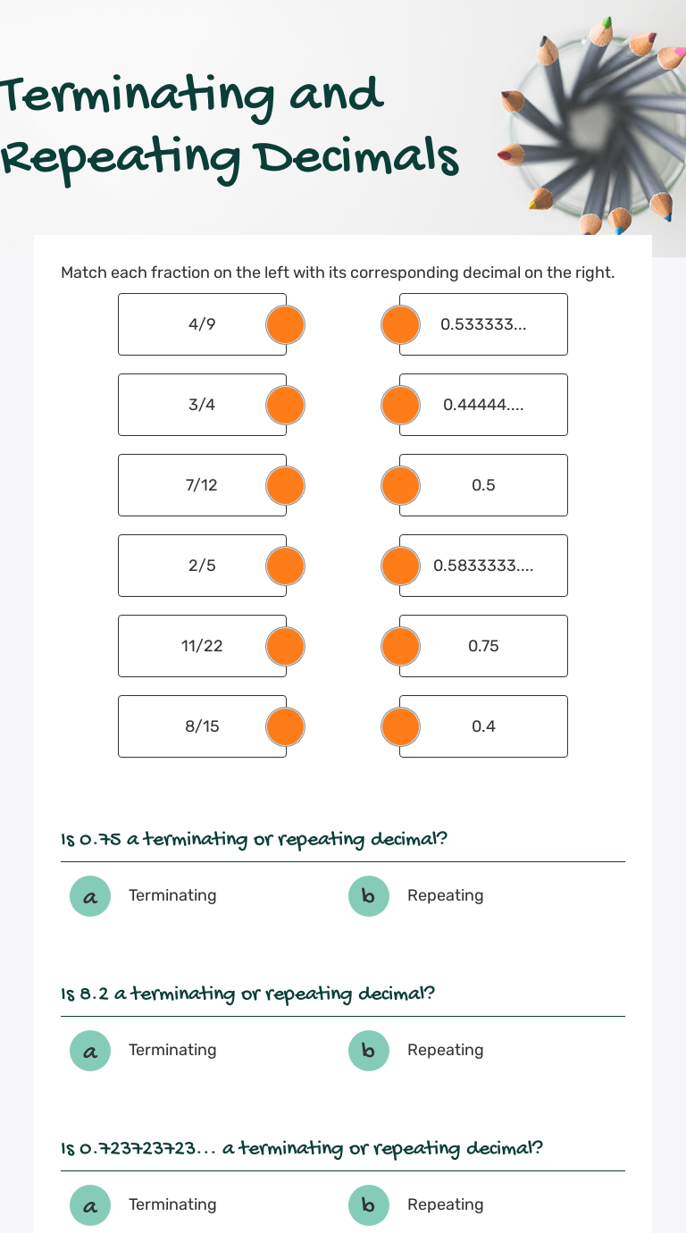 Use division to convert these fractions to recurring decimals. The questions are based in expressing the decimal form. Terminating and repeating decimals worksheet write each fraction as a decimal. In section a, students will use their.