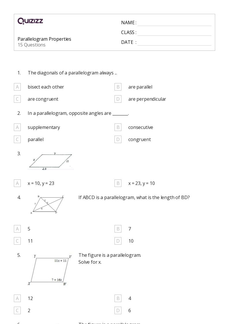 Worksheet On Properties Of Parallelograms - Q.2 which of the statement is true? Properties of parallelograms complete the following proof of the theorem: Some of the worksheets displayed are 6 properties of parallelograms, properties of parallelograms work, geometry work. Q.1 _______ sides of a parallelogram are parallel. ”if a quadrilateral is a parallelogram, then its. Learn the basic properties of a parallelogram. Walk through a multitude of printable parallelogram worksheets, meticulously drafted for students of grade 3 through grade 8. The provided worksheet includes several problems that require students to apply their knowledge of parallelogram properties. In a parallelogram, adjacent angles are supplementary. Parallelogram properties worksheets help students to understand the concept and properties of parallelogram with examples.