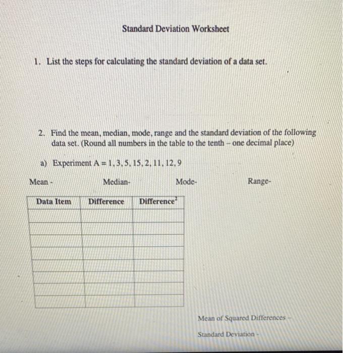 [Solved] Standard Deviation Worksheet 1. List the steps fo