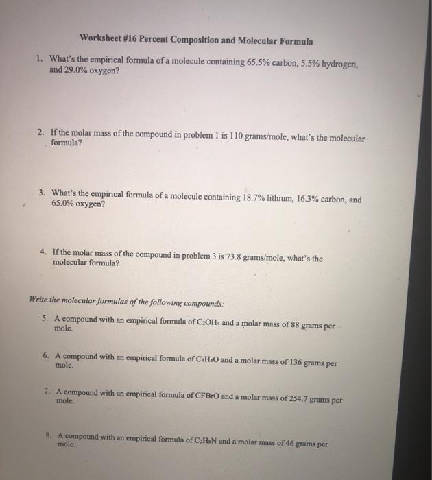 What is the empirical formula. Calculate the percent of nitrogen in urea, nh 2 conh 2. Mass % composition, empirical formulas, and molecular formulas mass % composition: Chemistry worksheet with problems on empirical & molecular formulas, mass percent, and balancing equations. Percent composition and molecular formula worksheet solutions 1) what’s the empirical formula of a molecule containing 65.5% carbon,.